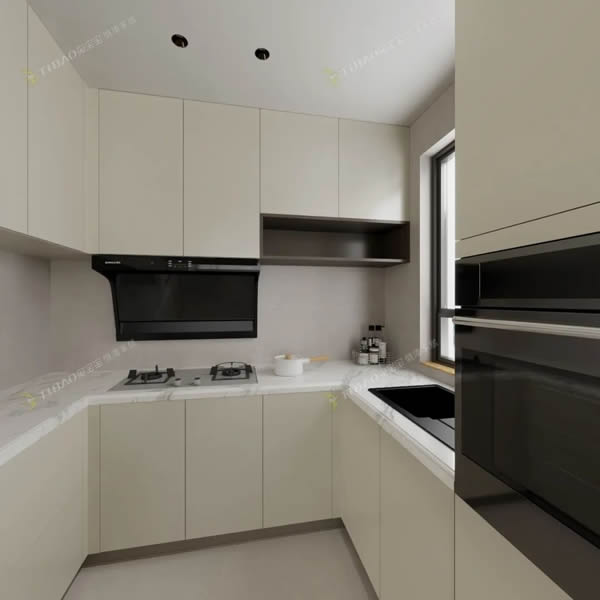 厨房也是奶油风的空间设计,以U字形的操作台,装入奶油色的橱柜,右侧还加入嵌入式电器柜,为主人打造了一个时尚高级而又实用的厨房烹饪空间。